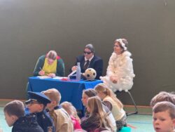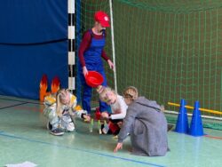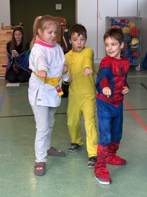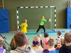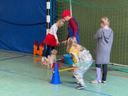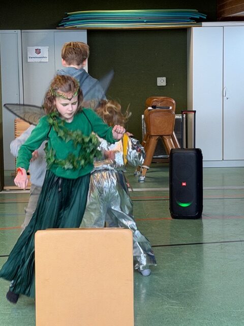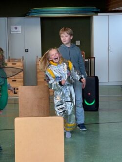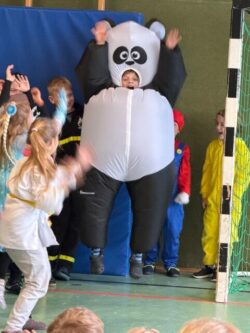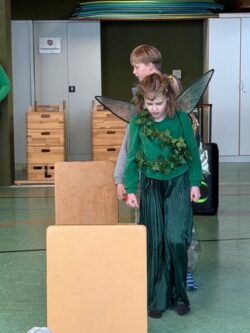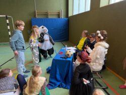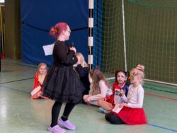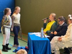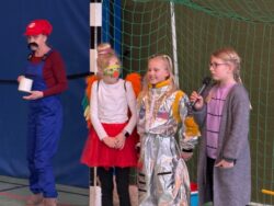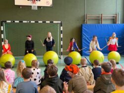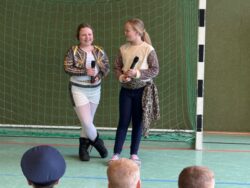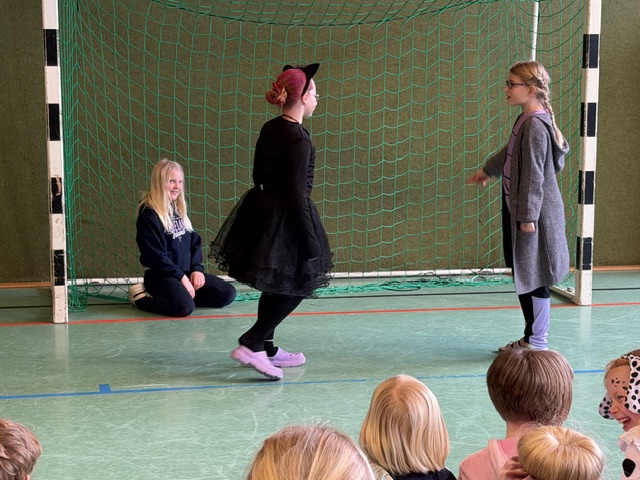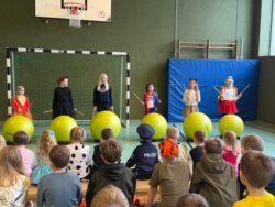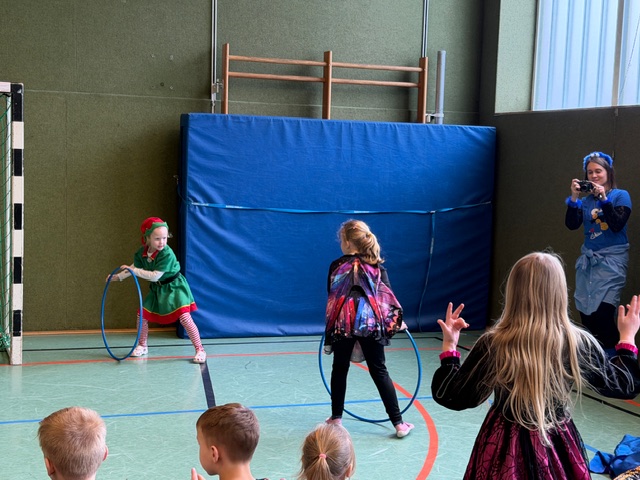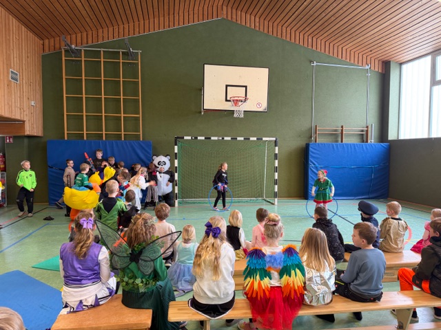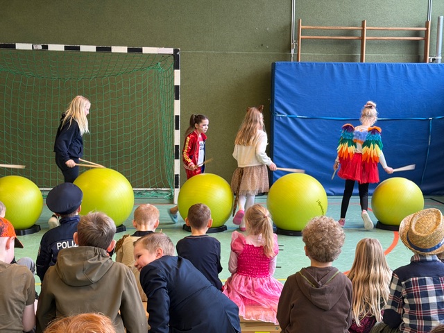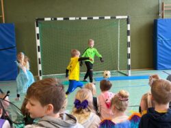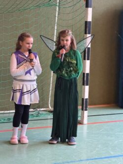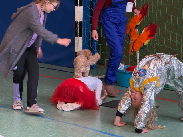 Das Programm war abwechslungsreich und mit viel Begeisterung vorbereitet: Aus dem Bereich Sport begeisterte eine Karate-Show das Publikum. Musikalisch wurde es mit zwei gefühlvoll vorgetragenen Duetten und einer mitreißenden Trommel-Performance auf Gymnastikbällen. Für besonders großen Applaus sorgte auch unser Schulhund Frieda, der fleißig Socken von der Leine holte und damit beim „Aufräumen“ half. Außerdem wurden mehrere kurze Theaterstücke aufgeführt, die das Publikum zum Lachen brachten.