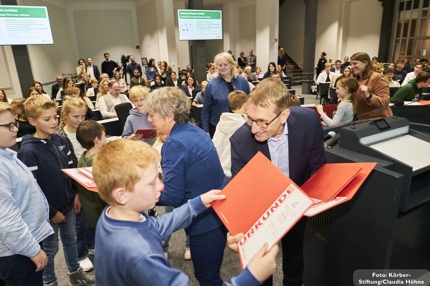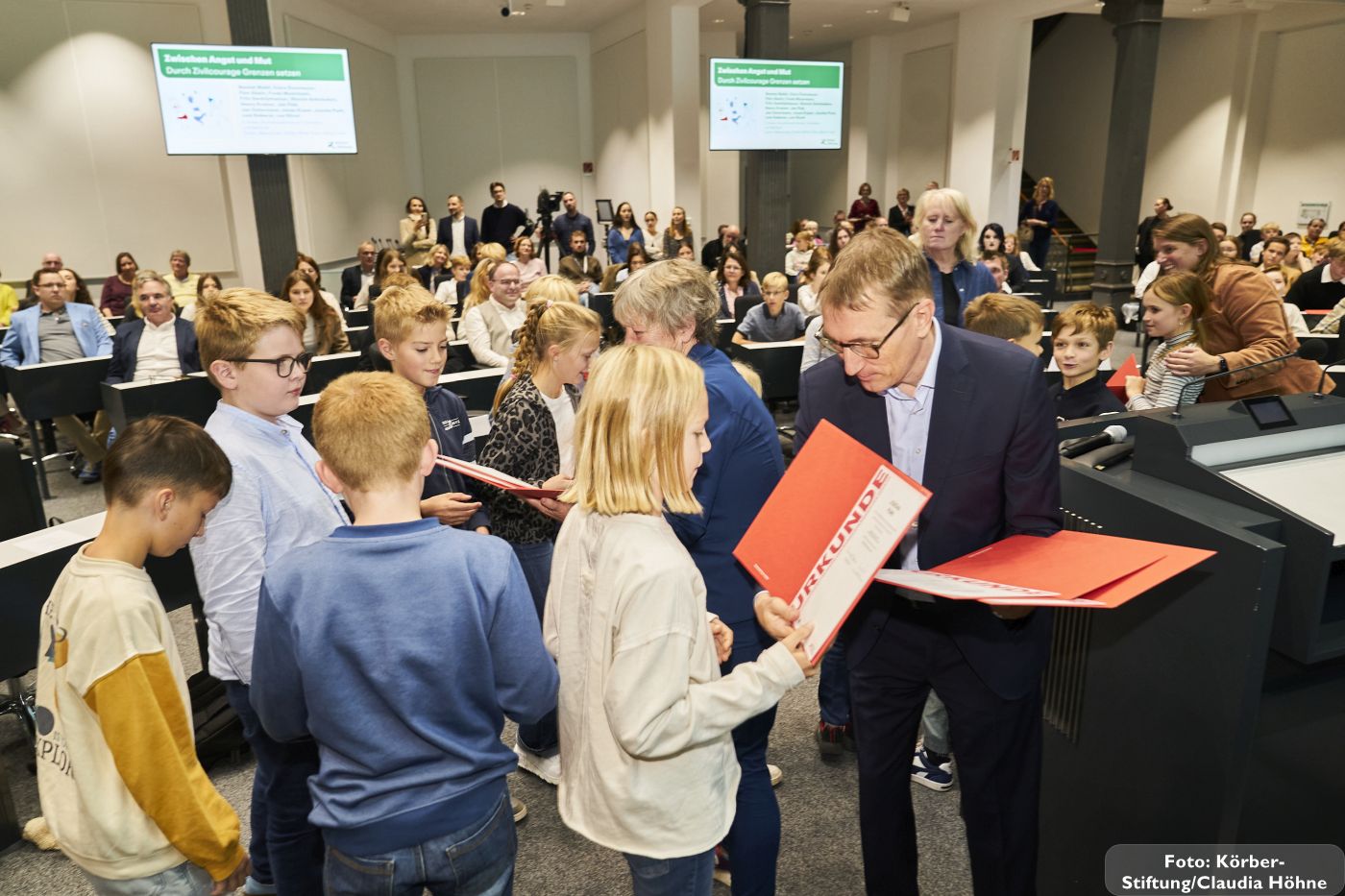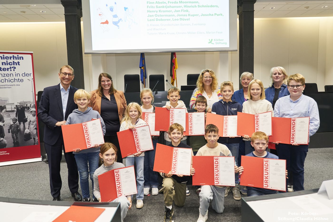 Insgesamt gab es dieses Jahr bei dem Geschichtswettbewerb des Bundespräsidenten zum Thema „Bis hierhin und nicht weiter!? Grenzen in der Geschichte“ in Niedersachsen, mehr als 600 Kinder und Jugendliche, die sich beteiligt haben und auf Spurensuche in der Familien- und Regionalgeschichte gegangen sind. Für dieses großartige Engagement wurden wir gestern in Hannover im Forum des niedersächsischen Landtags geehrt und die beteiligten Kinder mit Urkunden ausgezeichnet. Die Urkunden überreichte die Präsidentin des Niedersächsischen Landtags, Hanna Naber. Im Anschluss an die Preisverleihung gibt es bei einem Empfang die Möglichkeit zum persönlichen Austausch bei Häppchen, Kuchen und leckeren Getränken.